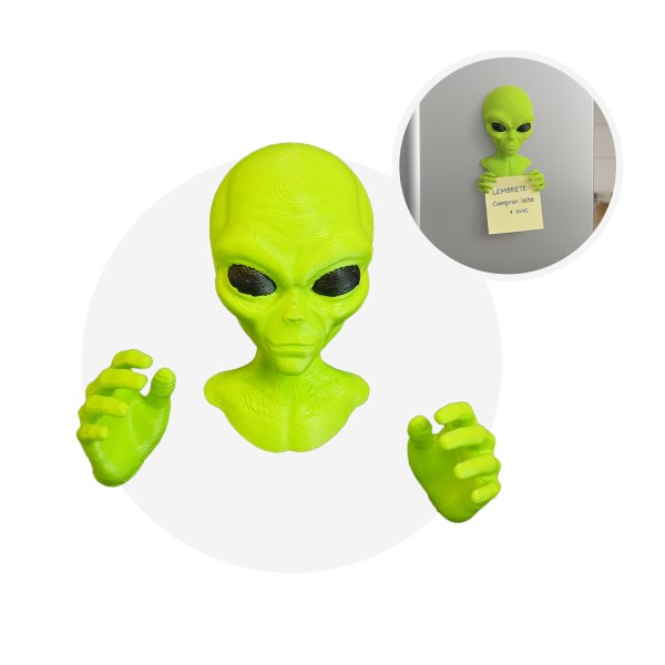 Design: Um divertido ímã no formato de uma cabeça e torso de um alienígena verde e suas mãos, podendo ser usado para segurar 3 lembretes.